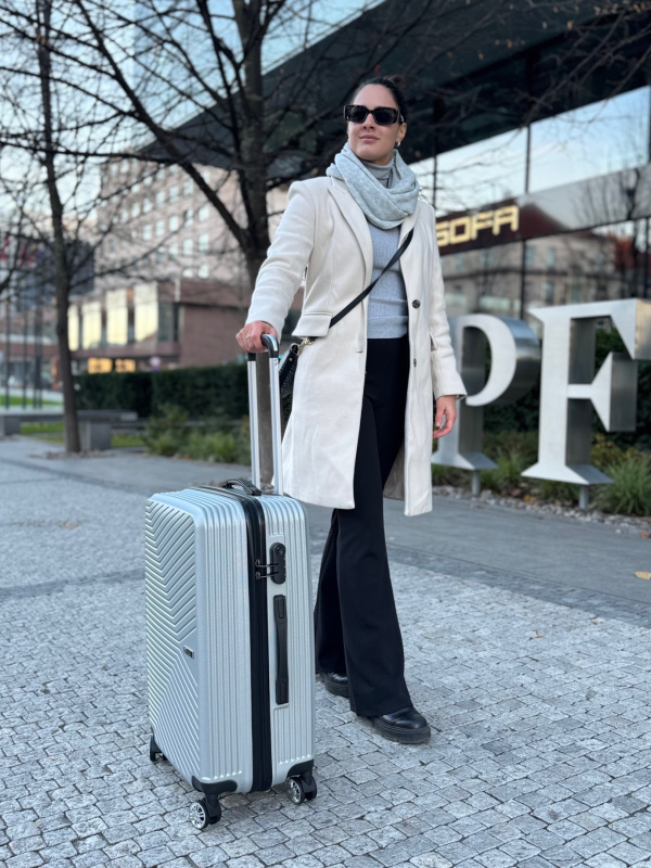 Moderní kufr s čistým designem v elegantní stříbrné barvě – lehký, praktický a ideální na týdenní cestování.