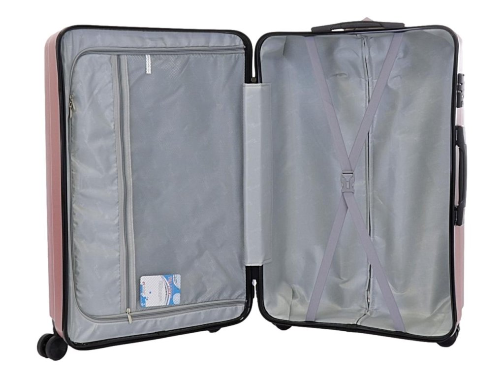 Double compartment division of the trunk. One side closes with a zipper, the other with a cross lock. The material used inside the suitcase is 210D polyester. The suitcase is equipped with a service zipper on each side for possible replacement of spare parts.