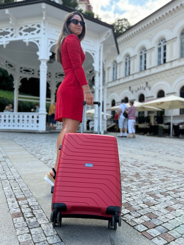 The suitcase has stabilizing side feet. Compact size meets airline carry-on requirements. Spare parts (wheels, locks, handles) are available in stock.