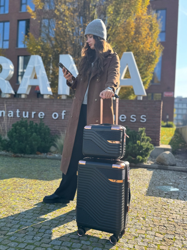 Kufr je vyroben z kombinace ABS a polykarbonátu – materiálů, které spojují nízkou hmotnost a vysokou odolnost vůči nárazům. Strukturovaný povrch lépe maskuje drobné škrábance a černý matný odstín dodává moderní, profesionální vzhled.
