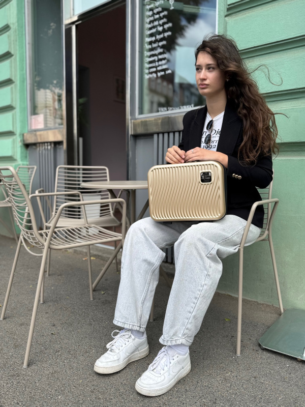 Luxusní kosmetický kufřík v barvě champagne pro všechny, kdo chtějí spojit eleganci s praktičností na cestách.