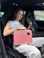 Horní měkčené madlo je příjemné do ruky. Zadní pružný pásek umožňuje upevnit kufřík na výsuvnou rukojeť cestovního kufru.