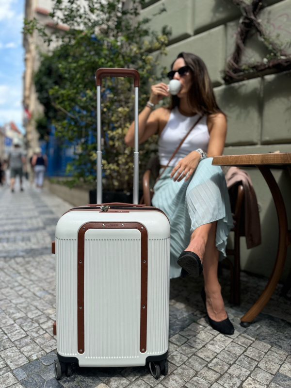 Tento příruční kufr spojuje moderní vzhled skořepiny s hnědými koženými doplňky, které slouží nejen jako estetický prvek, ale i ochrana proti poškrábání. Kombinace bílé barvy s hnědými detaily působí luxusně a originálně.