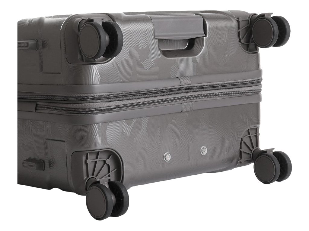 Kufr je osazen čtyřmi dvojitými kolečky otočnými o 360°. Jsou tichá, stabilní a snadno vyměnitelná, což zajišťuje komfortní pohyb ve všech směrech.
