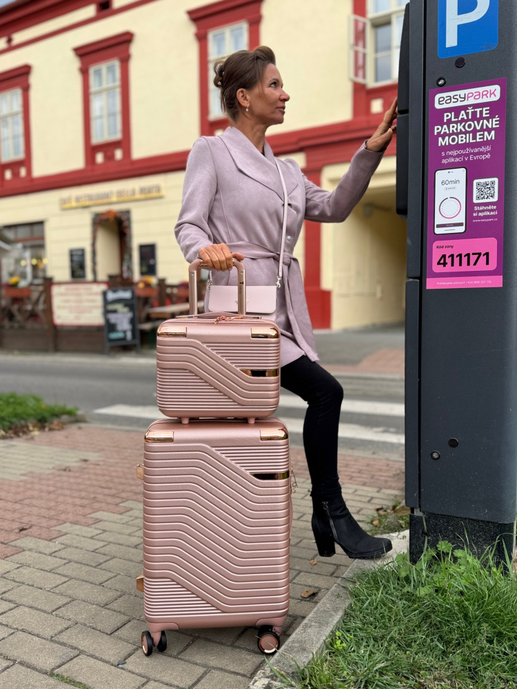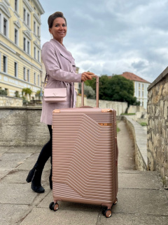 Tělo kufrů tvoří kombinace ABS + polykarbonát pro skvělý poměr odolnosti a hmotnosti. Matný povrch lépe maskuje drobné škrábance a elegantní rosegold detaily (rohy, kolečka, zámek, madla) zajišťují prémiový vzhled.