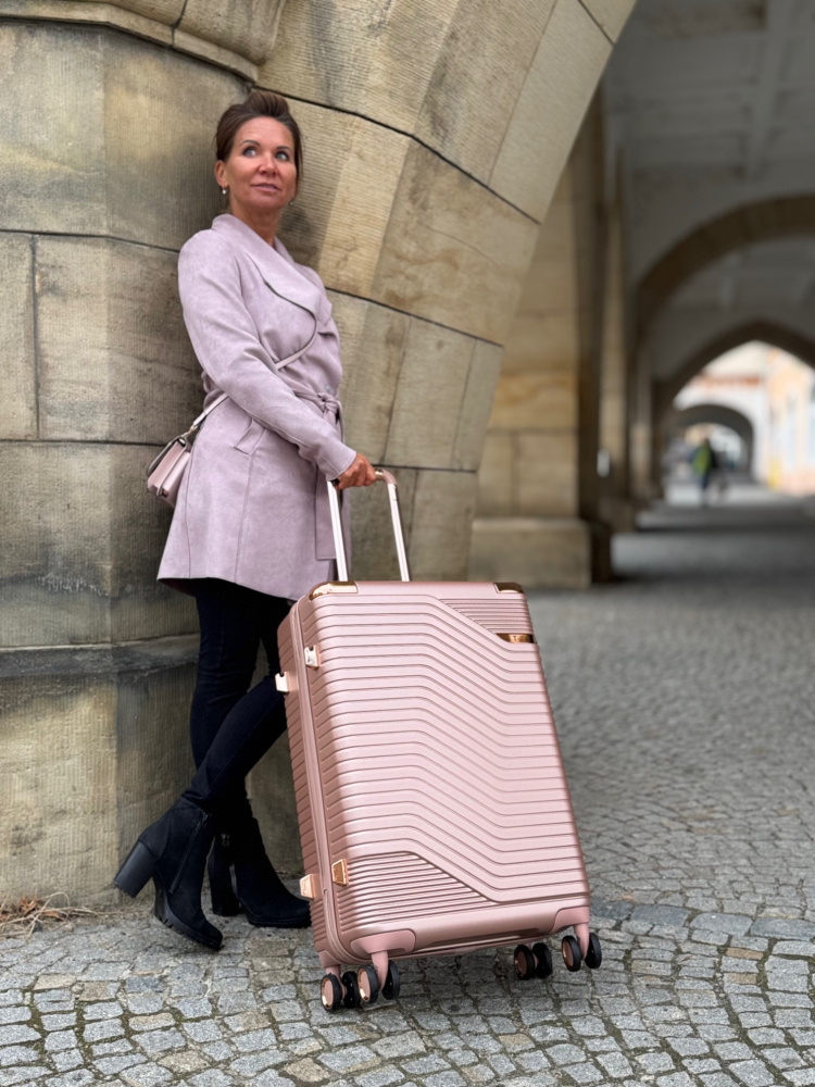 Vyrobená z ABS + polykarbonátu, velmi odolná a pružná skořepina kufru. Matný texturovaný povrch lépe odolává škrábancům, zatímco rosegold detaily dodávají luxusní vzhled.